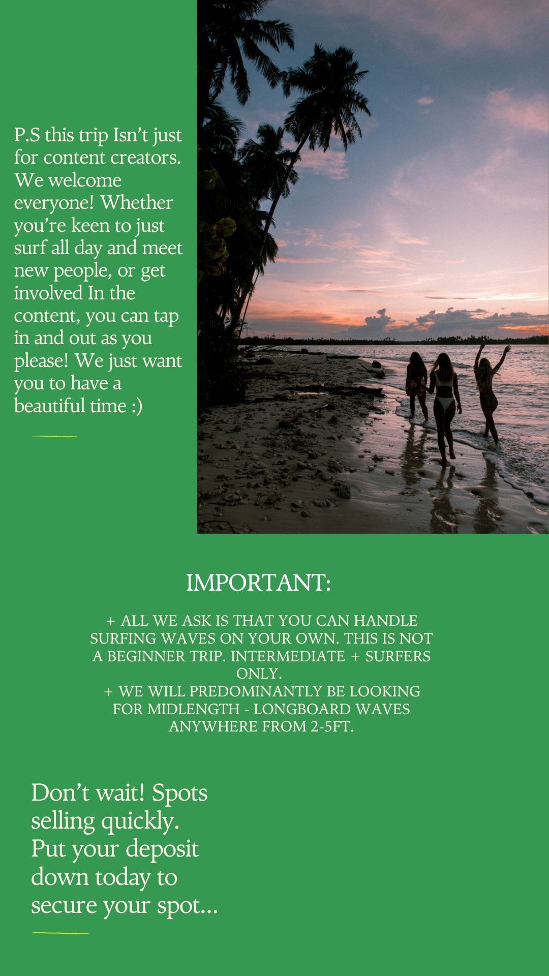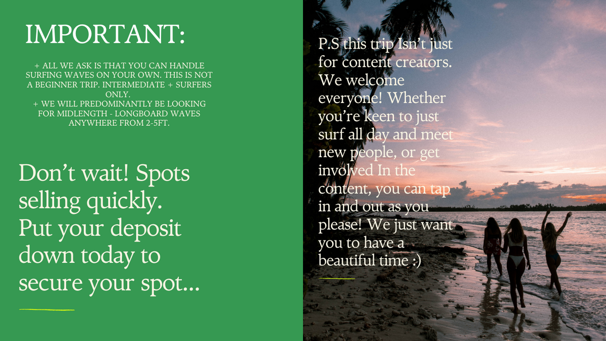 Our surf gang values authenticity and cares about having a damn good time. We don't take things too seriously and believe that every moment has the potential to be the best memory. Taking risks, paddling for that wave, laughing over sunset beers and getting ready to go to it all again the next day is what it's all about.